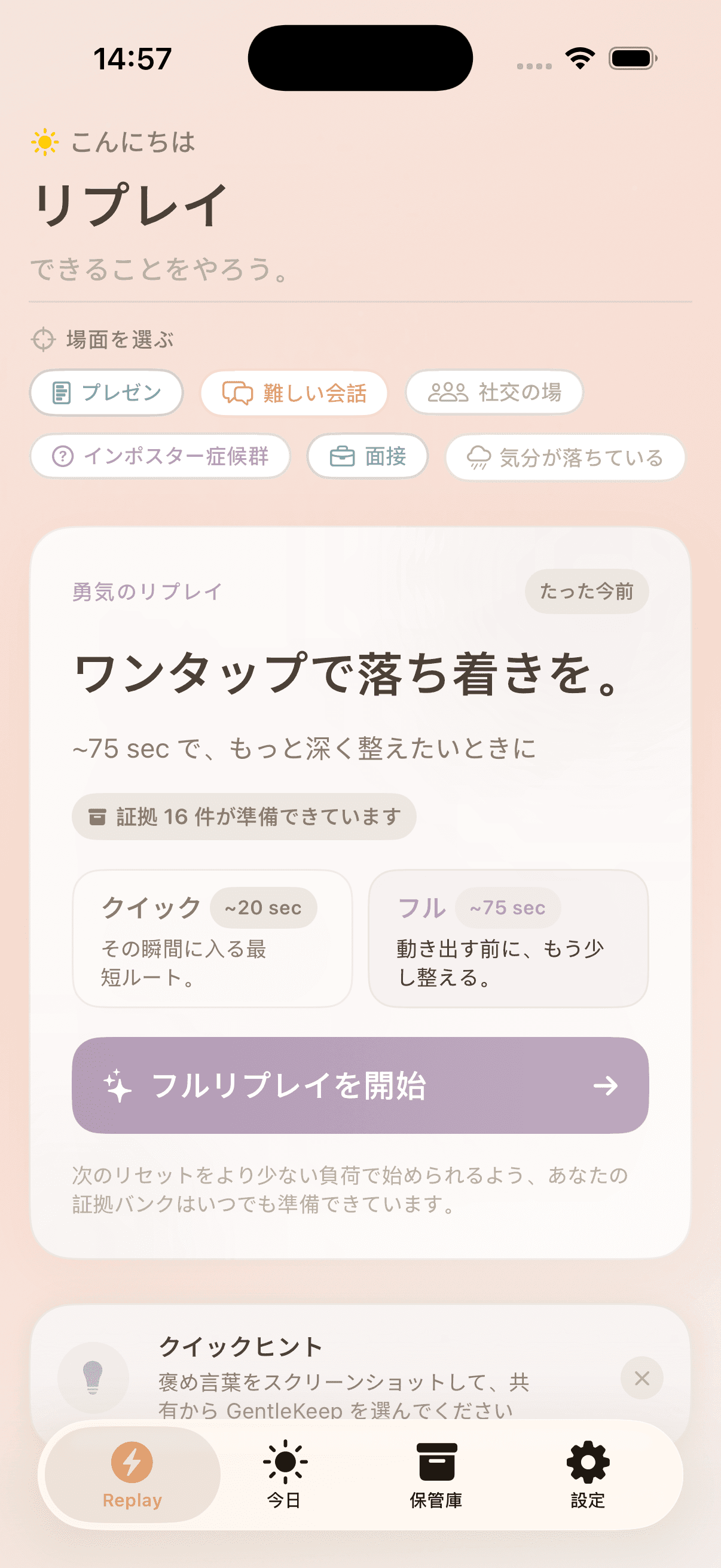 大事な予定が近づいています。リプレイをタップして、呼吸法とあなた自身の記録でリセットしましょう。