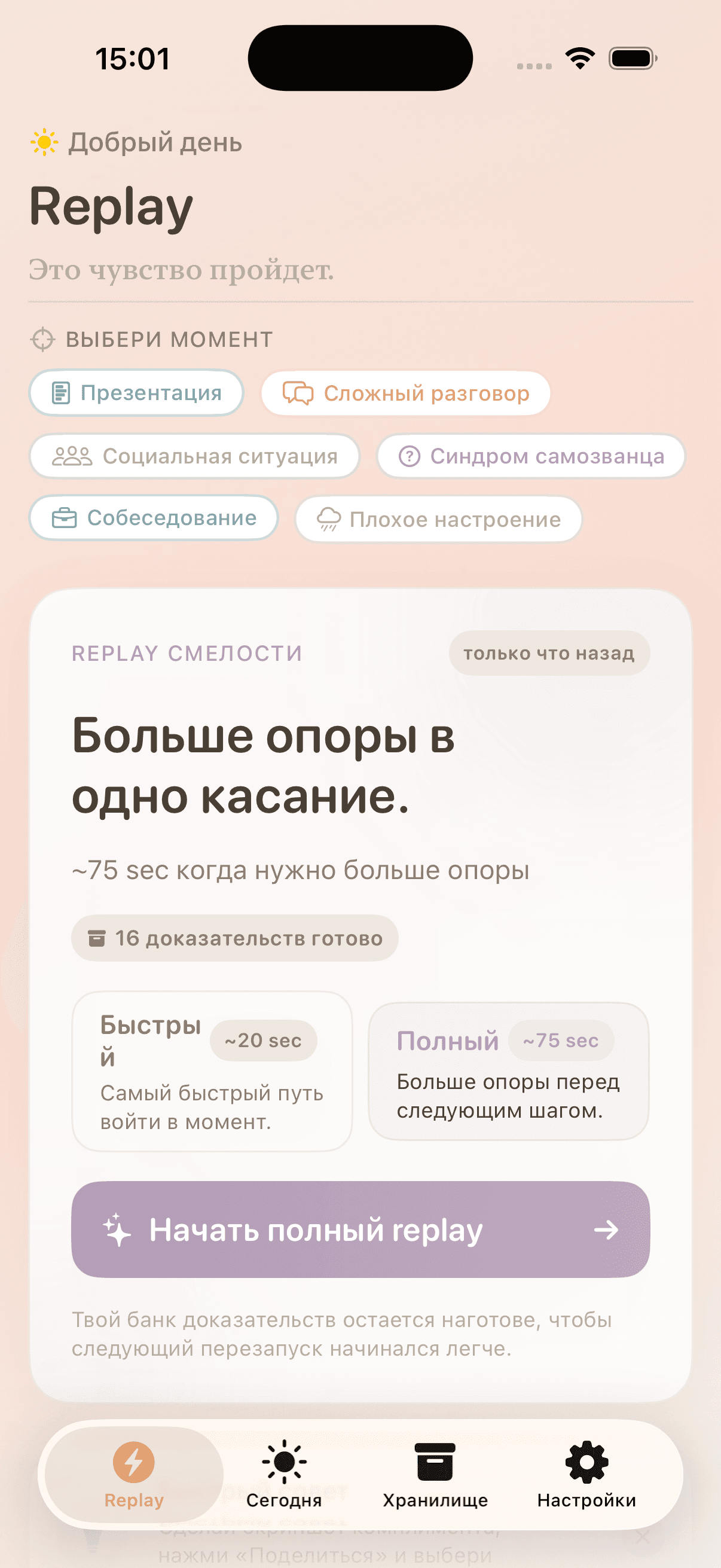 Создайте уверенность, к которой можно обратиться в любой момент. Записывайте свои победы, комплименты и смелые моменты каждый день—а затем воспроизводите их с направленным дыханием перед презентациями, разговорами и в любой момент, когда вам нужна смелость.